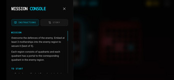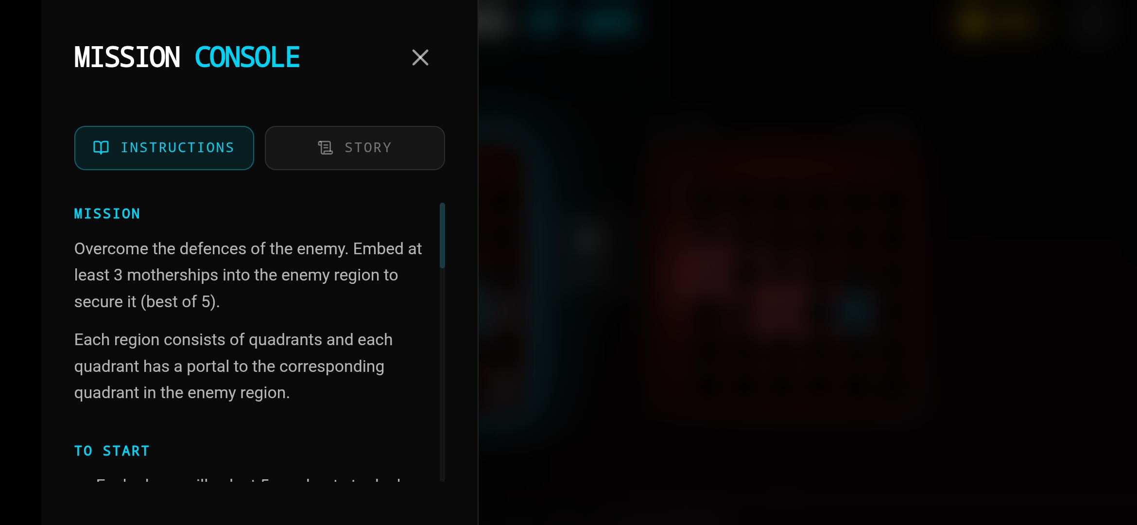 Overcome the defences of the enemy, one quadrant at a time. Build 3 motherships in the enemy region to secure it (best of 5 for the starting 6x6 gameboard).